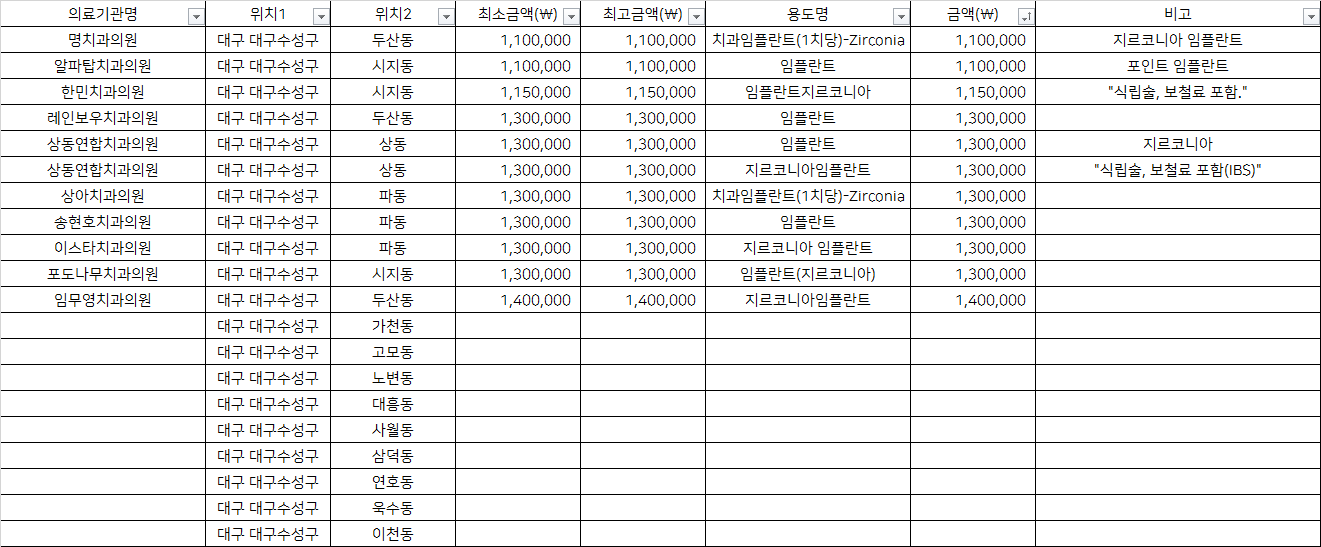 대구 수성구 기타동 지르코니아 임플란트 치과 가격 top5 명 알파탑 한민