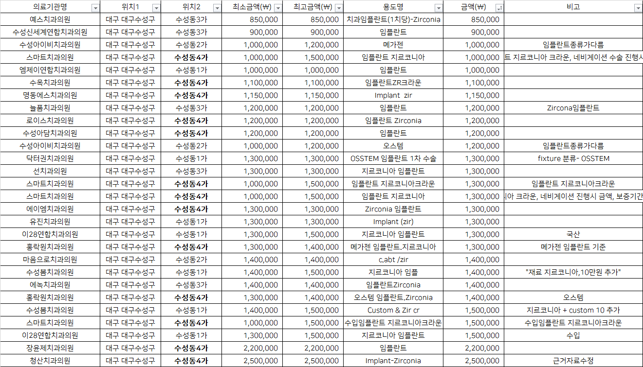 대구 수성구 수성동1~4가 지르코니아 임플란트 치과 가격 top5 예스 수성신세계연합 수성아이비