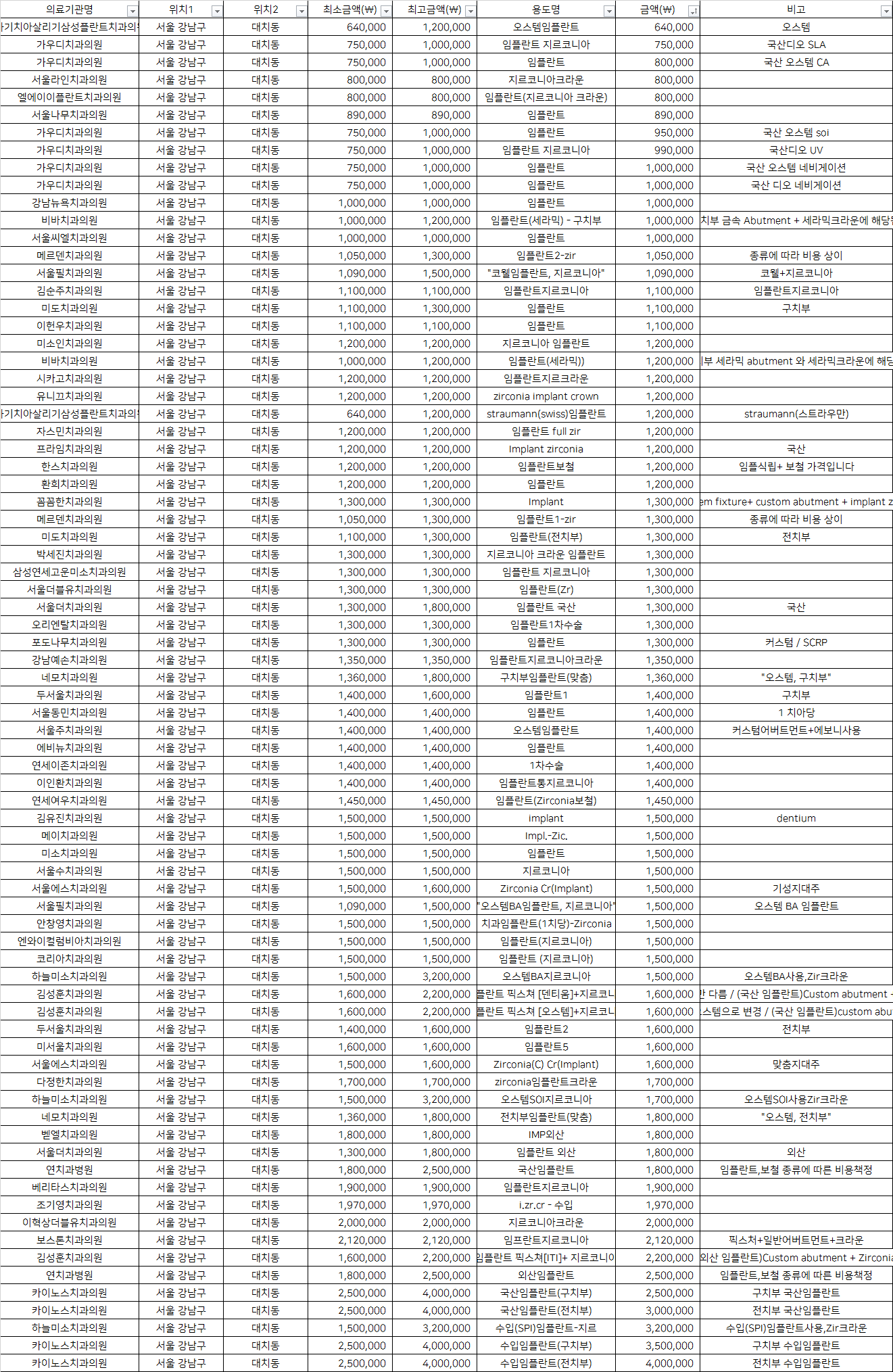 | 서울더치과의원 | 임플란트 외산 | 1,800,000 | 외산 |