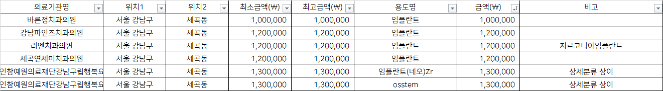 | 의료법인참예원의료재단강남구립행복요양병원 | 임플란트(네오)Zr | 1,300,000 | 상세분류 상이 |
