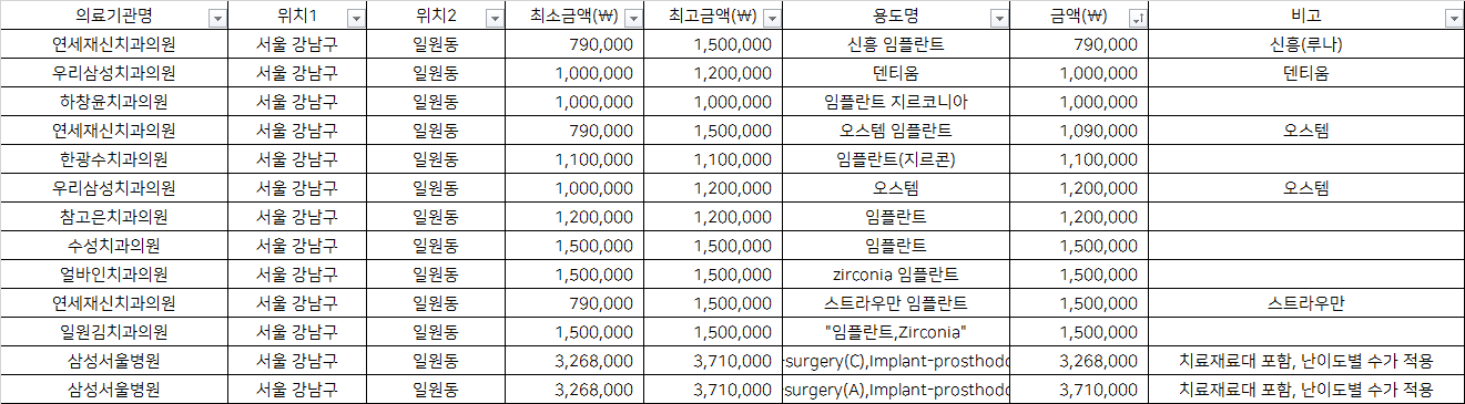 | 일원김치과의원 | "임플란트,Zirconia" | 1,500,000 | |