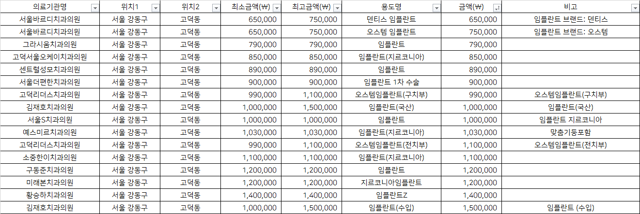 | 고덕리더스치과의원 | 오스템임플란트(구치부) | 990,000 | 오스템임플란트(구치부) |