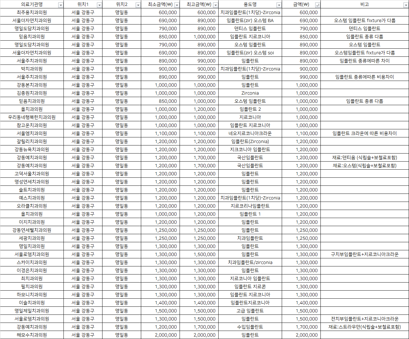 | 강동본치과의원 | 임플란트 | 1,000,000 | |