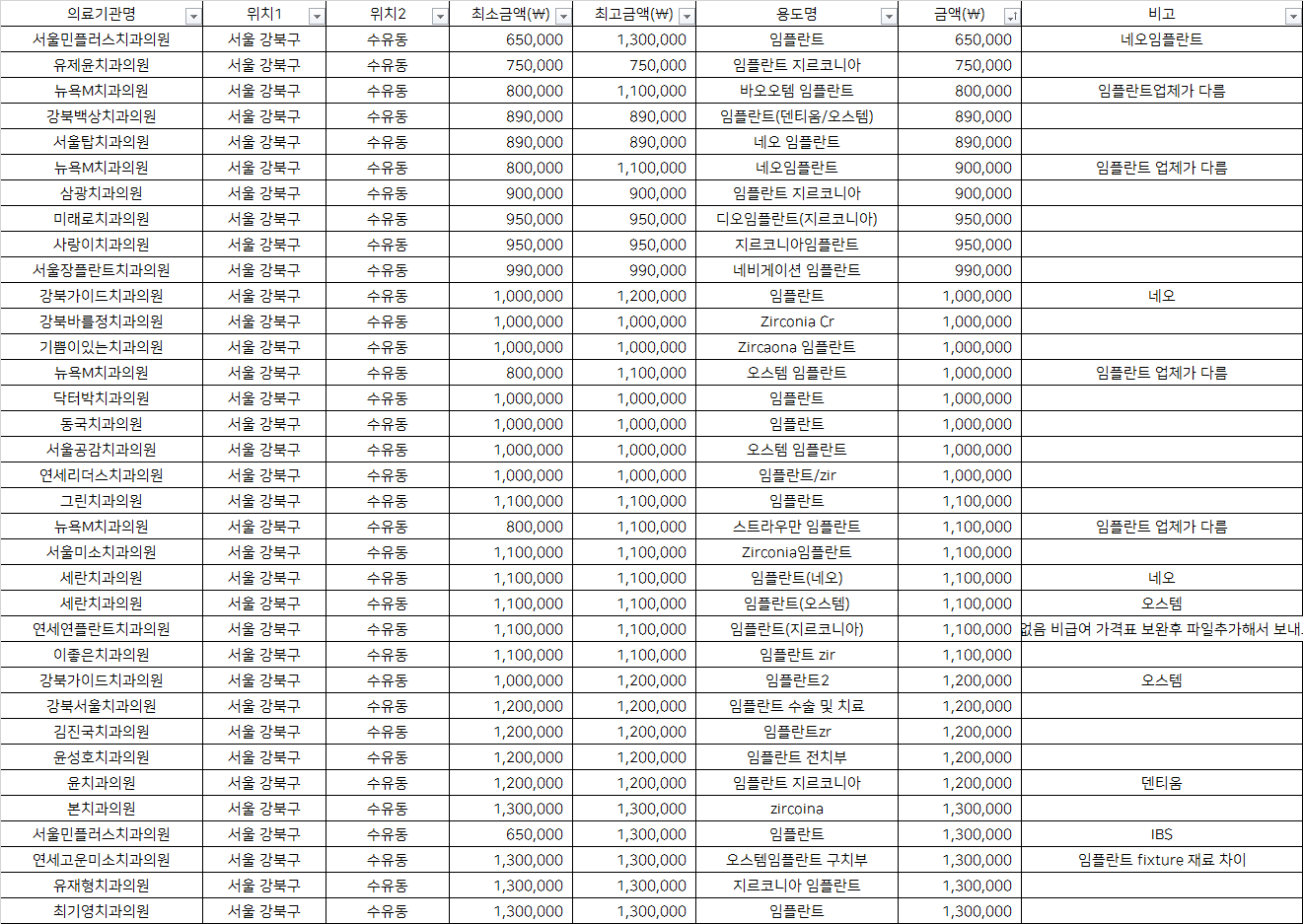 뉴욕M치과의원 네오임플란트               900,000 임플란트 업체가 다름