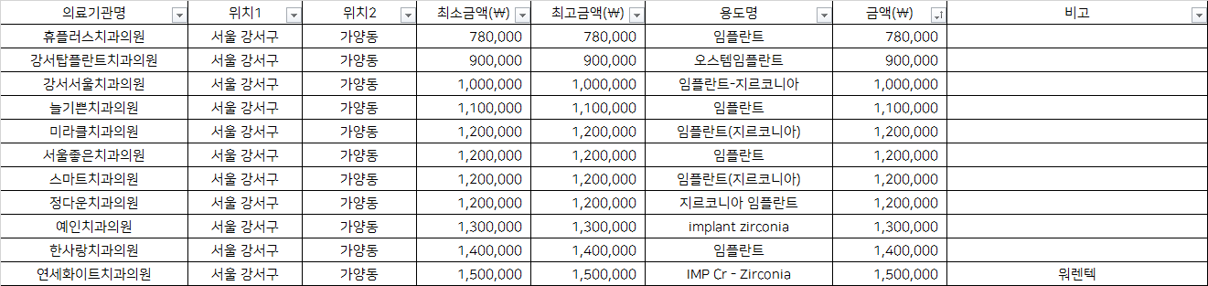 | 강서서울치과의원 | 임플란트-지르코니아 | 1,000,000 | |