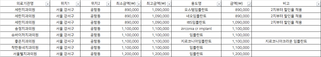 | 서울웰치과의원 | 임플란트 | 1,200,000 |