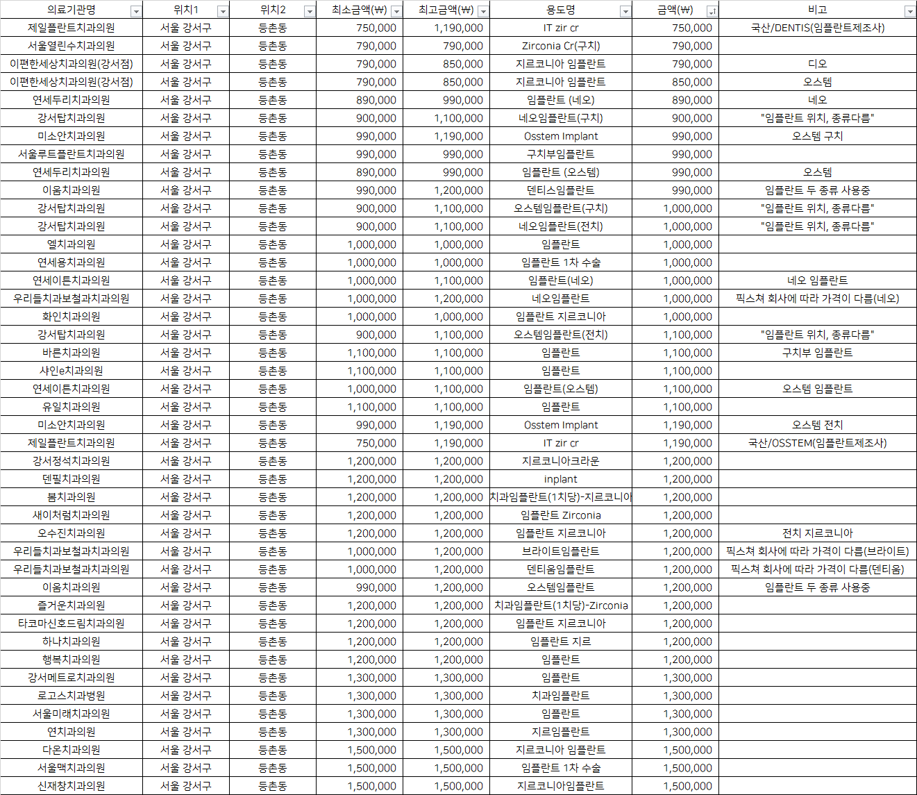 | 강서탑치과의원 | 오스템임플란트(구치) | 1,000,000 | "임플란트 위치, 종류다름" |