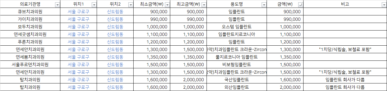 | 탑치과의원 | 국산임플란트 | 1,600,000 | 임플란트 회사가 다름 |