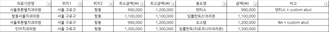 의료기관명 용도명 금액(₩) 비고