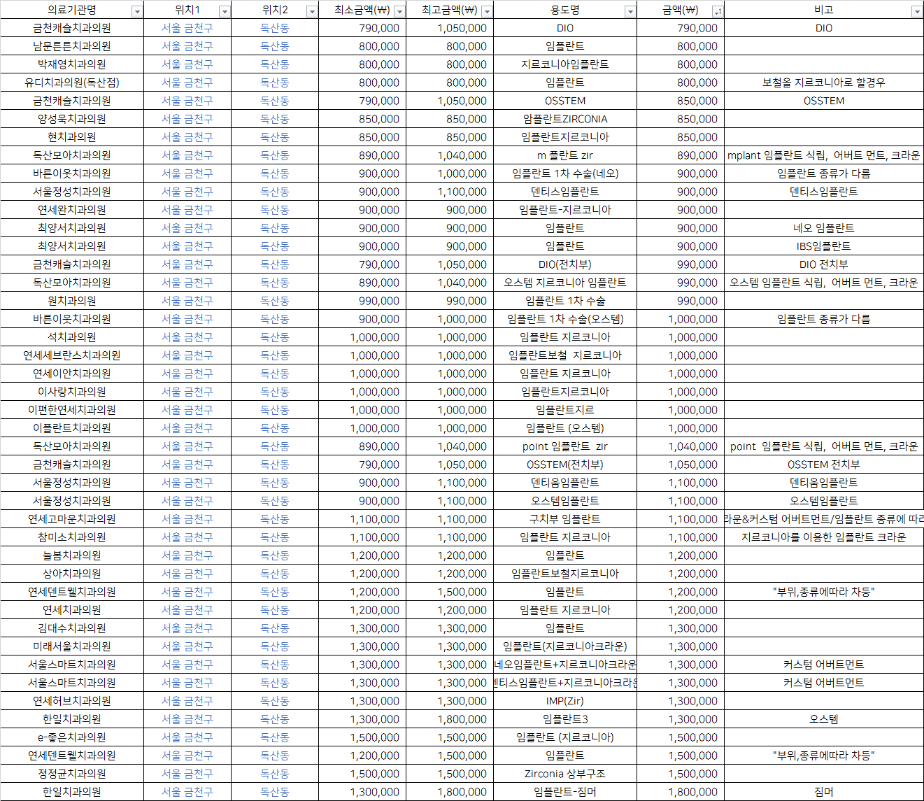 | 금천캐슬치과의원 | OSSTEM(전치부) | 1,050,000 | OSSTEM 전치부 |