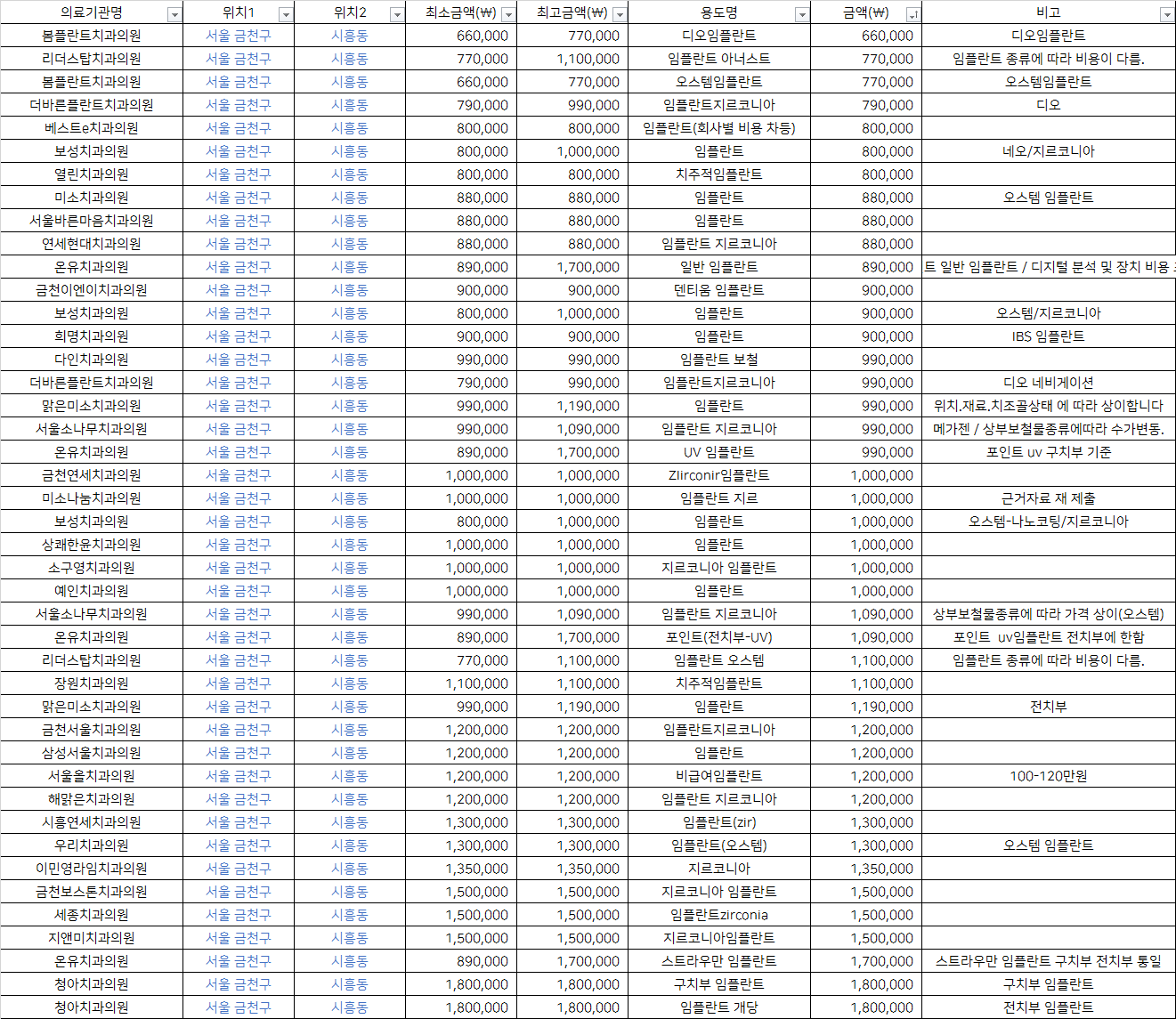 | 금천연세치과의원 | ZIirconir임플란트 | 1,000,000 | |