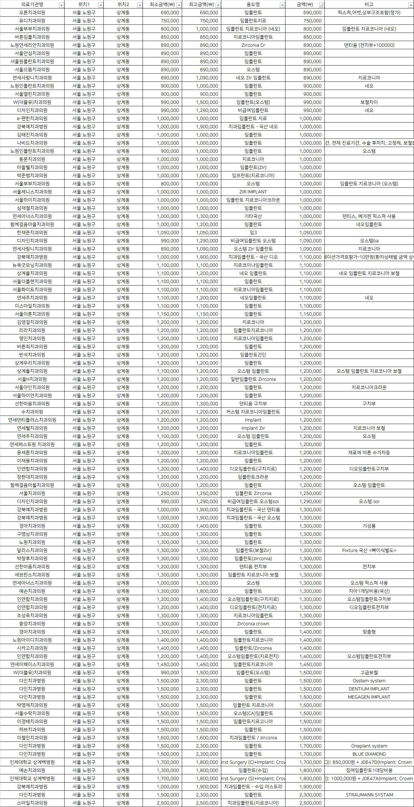 공개된 비급여 가격은 의료기관에서 제공한 것으로, 세부적인 금액은 의료기관에 확인하여 임플란트 시술에 참고하시기 바랍니다.