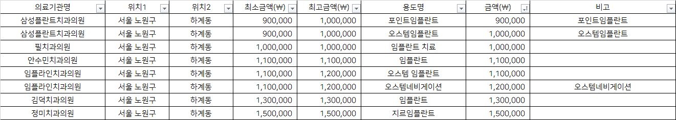 지역별 금액을 비교하시어 거주지 근처에서 저렴하게, 합리적인 비용으로 임플란트 시술 받으시기를 바랍니다.