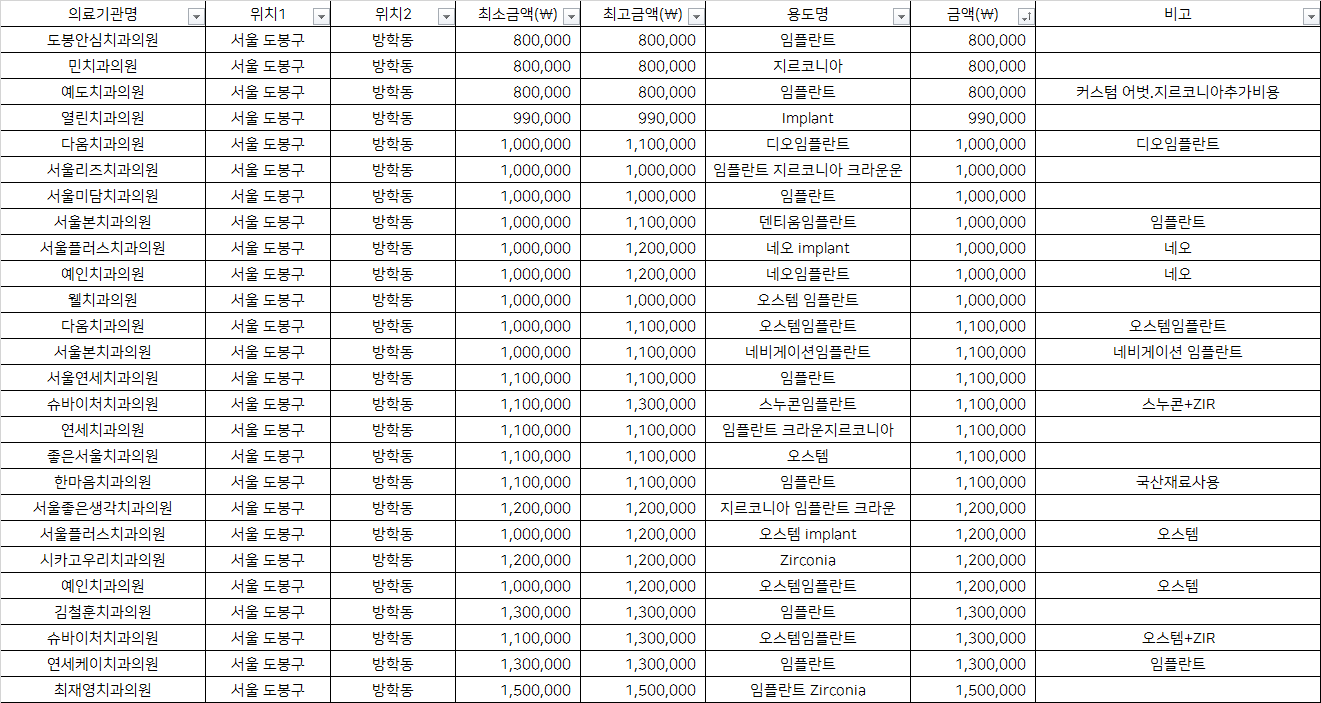 건강보험심사평가원 비급여 진료비용 정보 중, 서울 도봉구 방학동의 치과임플란트 1치당 지르코니아 가격을 기준으로 알려드립니다.
