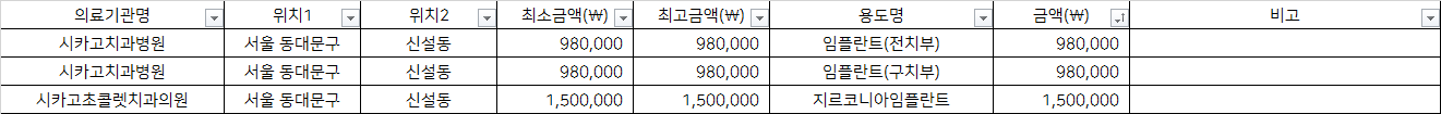 지역별 금액을 비교하시어 거주지 근처에서 저렴하게, 합리적인 비용으로 임플란트 시술 받으시기를 바랍니다.