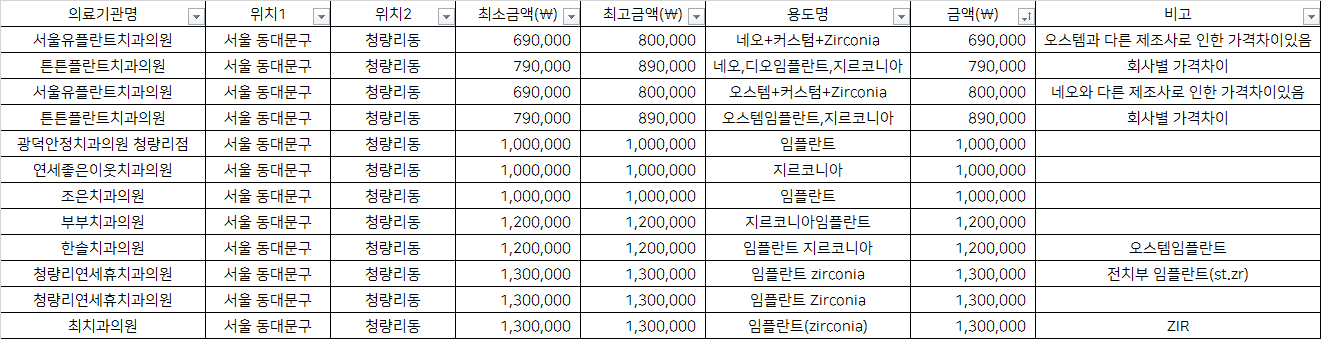 건강보험심사평가원 비급여 진료비용 정보 중, 서울 동대문구 청량리동의 치과임플란트 1치당 지르코니아 가격을 기준으로 알려드립니다.