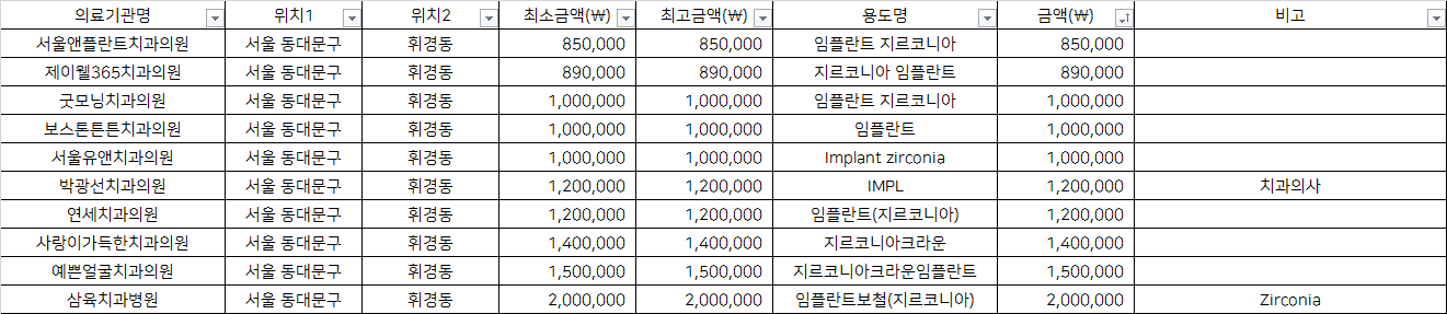 건강보험심사평가원 비급여 진료비용 정보 중, 서울 동대문구 휘경동의 치과임플란트 1치당 지르코니아 가격을 기준으로 알려드립니다.