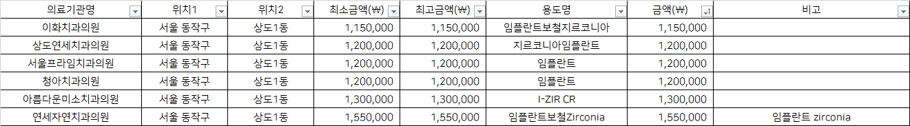 건강보험심사평가원 비급여 진료비용 정보 중, 서울 동작구 상도1동의 치과임플란트 1치당 지르코니아 가격을 기준으로 알려드립니다.