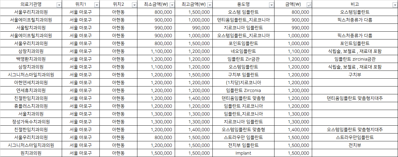 건강보험심사평가원 비급여 진료비용 정보 중, 서울 마포구 아현동의 치과임플란트 1치당 지르코니아 가격을 기준으로 알려드립니다.