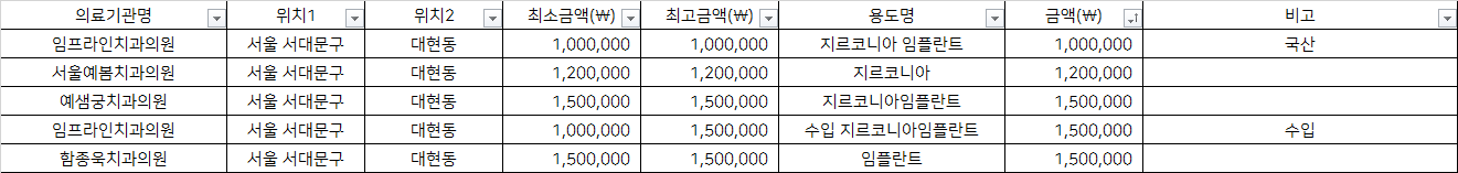 지역별 금액을 비교하시어 거주지 근처에서 저렴하게, 합리적인 비용으로 임플란트 시술 받으시기를 바랍니다.