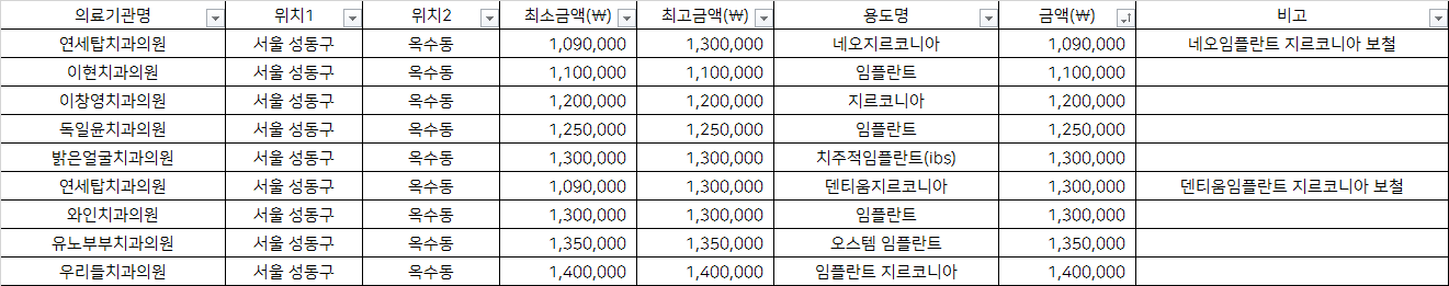 건강보험심사평가원 비급여 진료비용 정보 중, 서울 성동구 옥수동의 치과임플란트 1치당 지르코니아 가격을 기준으로 알려드립니다.