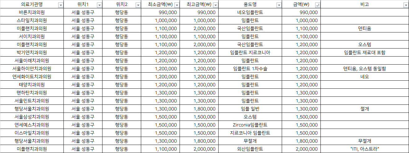 건강보험심사평가원 비급여 진료비용 정보 중, 서울 성동구 행당동의 치과임플란트 1치당 지르코니아 가격을 기준으로 알려드립니다.