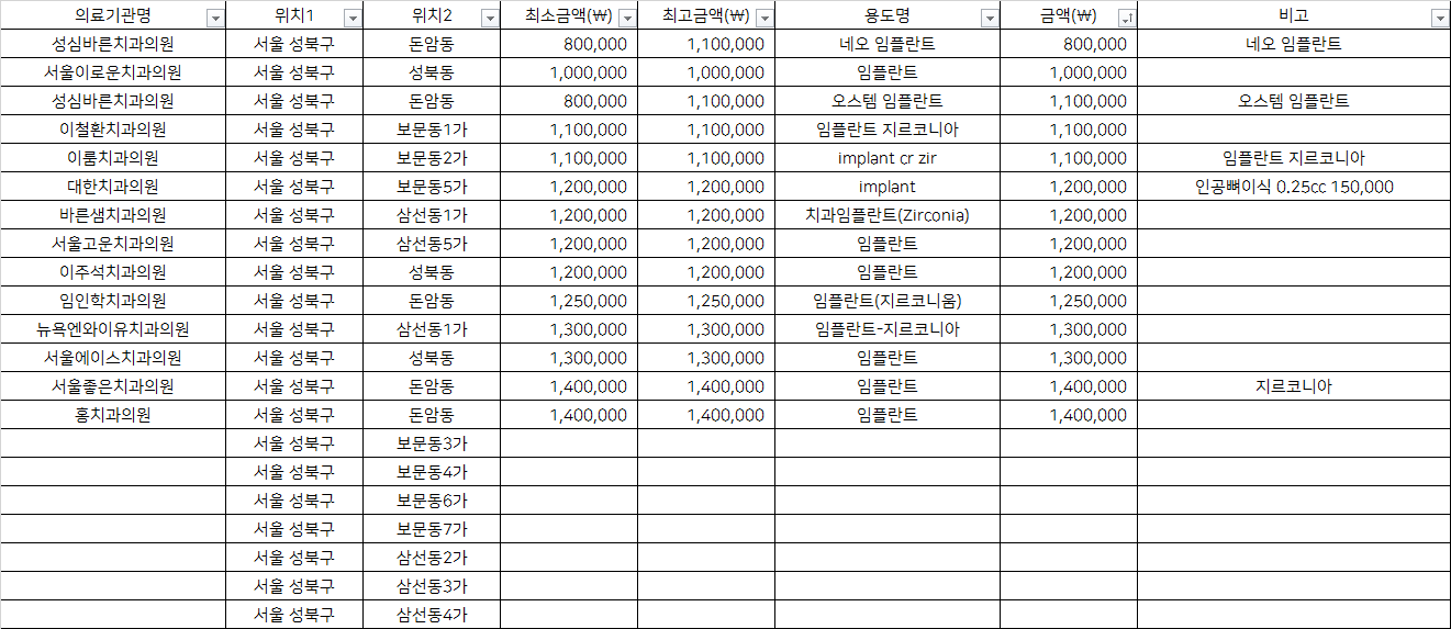 건강보험심사평가원 비급여 진료비용 정보 중, 서울 성북구 기타동의 치과임플란트 1치당 지르코니아 가격을 기준으로 알려드립니다.