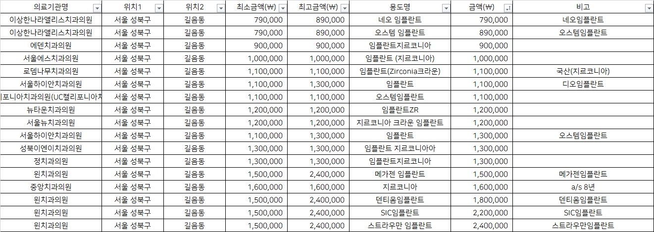 지역별 금액을 비교하시어 거주지 근처에서 저렴하게, 합리적인 비용으로 임플란트 시술 받으시기를 바랍니다.