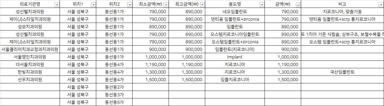 지역별 금액을 비교하시어 거주지 근처에서 저렴하게, 합리적인 비용으로 임플란트 시술 받으시기를 바랍니다.