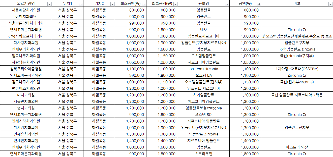 건강보험심사평가원 비급여 진료비용 정보 중, 서울 성북구 상월곡동,하월곡동의 치과임플란트 1치당 지르코니아 가격을 기준으로 알려드립니다.