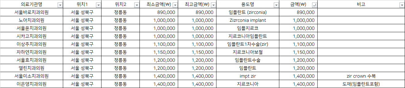 건강보험심사평가원 비급여 진료비용 정보 중, 서울 성북구 정릉동의 치과임플란트 1치당 지르코니아 가격을 기준으로 알려드립니다.