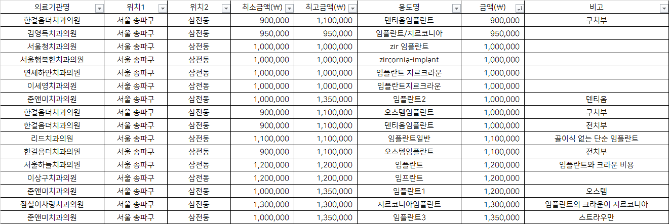 지역별 금액을 비교하시어 거주지 근처에서 저렴하게, 합리적인 비용으로 임플란트 시술 받으시기를 바랍니다.