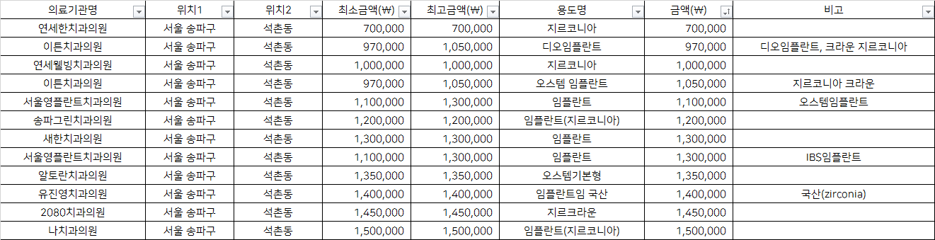 건강보험심사평가원 비급여 진료비용 정보 중, 서울 송파구 석촌동의 치과임플란트 1치당 지르코니아 가격을 기준으로 알려드립니다.