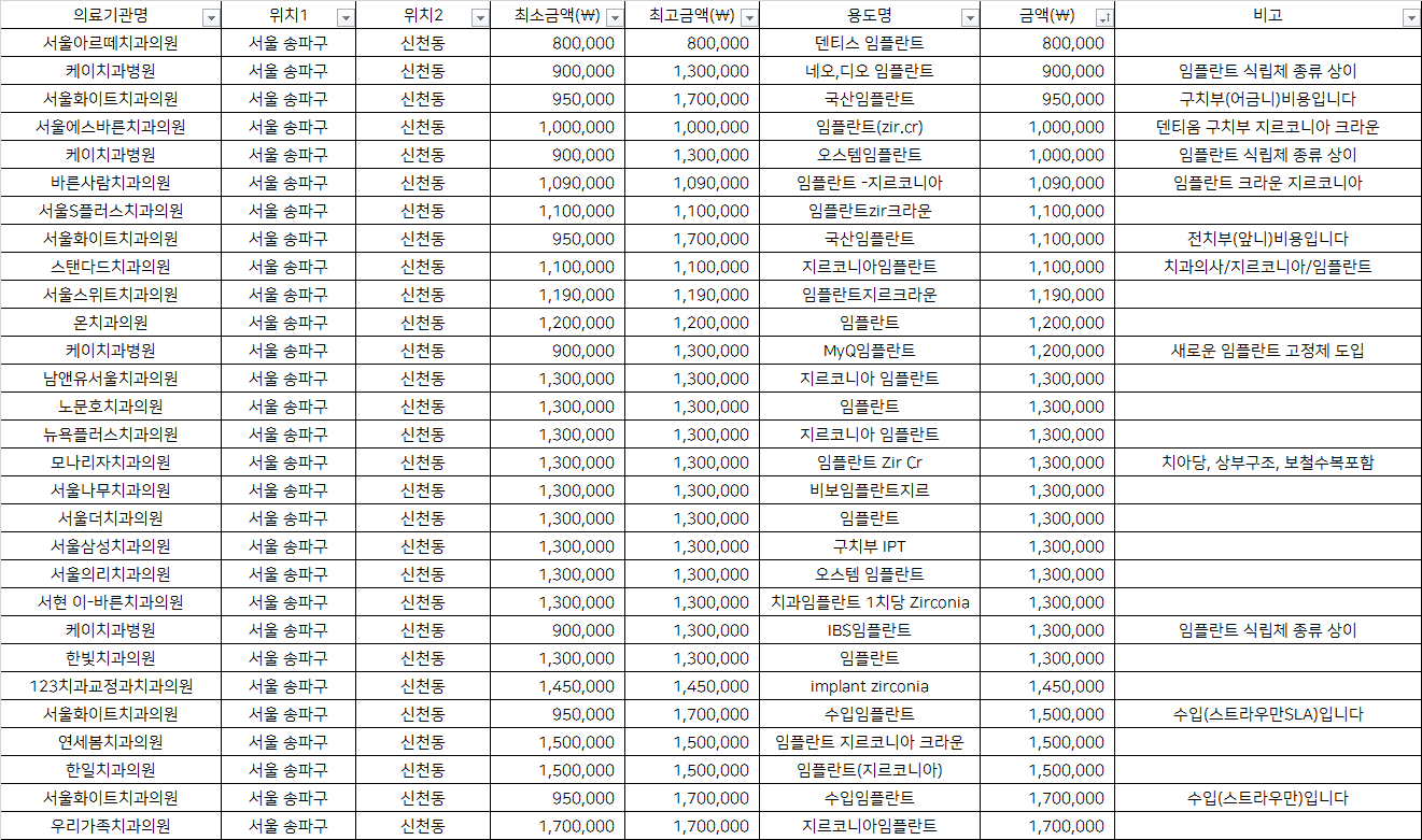 건강보험심사평가원 비급여 진료비용 정보 중, 서울 송파구 신천동의 치과임플란트 1치당 지르코니아 가격을 기준으로 알려드립니다.
