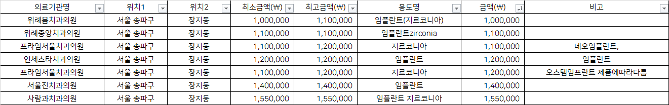 건강보험심사평가원 비급여 진료비용 정보 중, 서울 송파구 장지동의 치과임플란트 1치당 지르코니아 가격을 기준으로 알려드립니다.