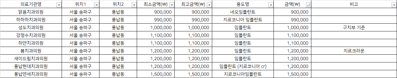 지역별 금액을 비교하시어 거주지 근처에서 저렴하게, 합리적인 비용으로 임플란트 시술 받으시기를 바랍니다.