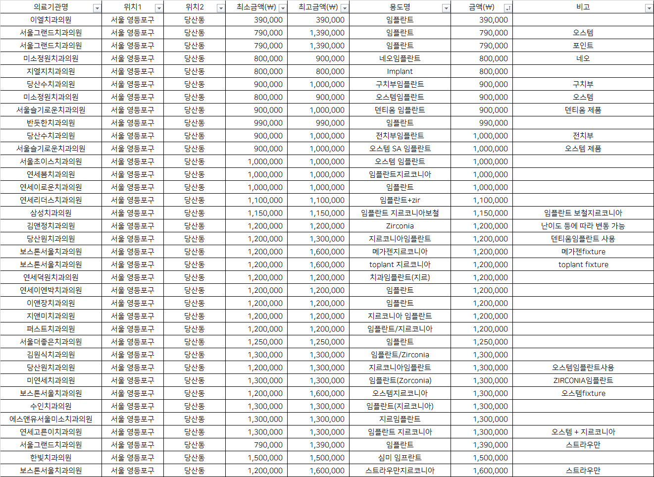건강보험심사평가원 비급여 진료비용 정보 중, 서울 영등포구 당산동의 치과임플란트 1치당 지르코니아 가격을 기준으로 알려드립니다.