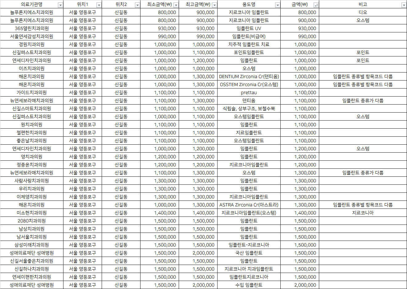 건강보험심사평가원 비급여 진료비용 정보 중, 서울 영등포구 신길동의 치과임플란트 1치당 지르코니아 가격을 기준으로 알려드립니다.