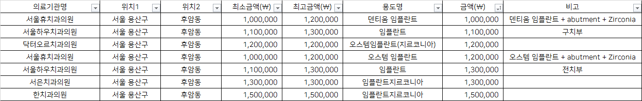 건강보험심사평가원 비급여 진료비용 정보 중, 서울 용산구 후암동의 치과임플란트 1치당 지르코니아 가격을 기준으로 알려드립니다.