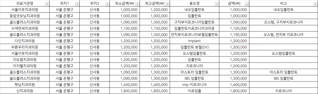 지역별 금액을 비교하시어 거주지 근처에서 저렴하게, 합리적인 비용으로 임플란트 시술 받으시기를 바랍니다.