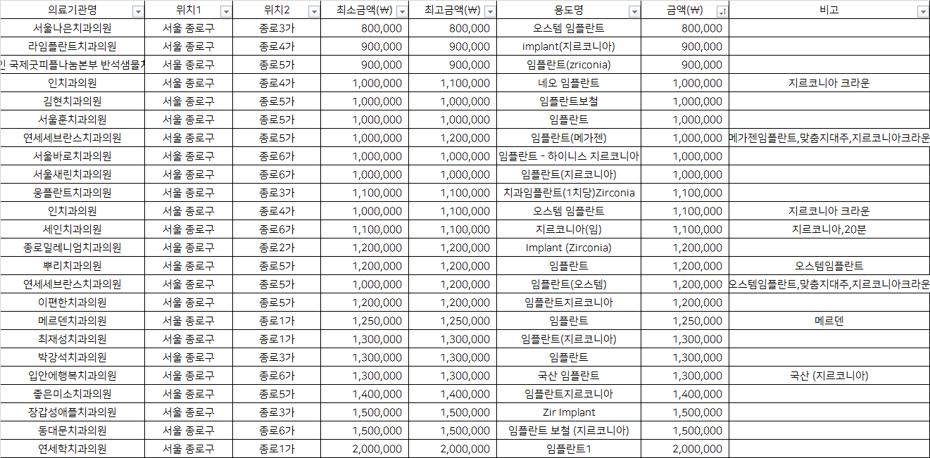 건강보험심사평가원 비급여 진료비용 정보 중, 서울 종로구 종로1~6가의 치과임플란트 1치당 지르코니아 가격을 기준으로 알려드립니다.