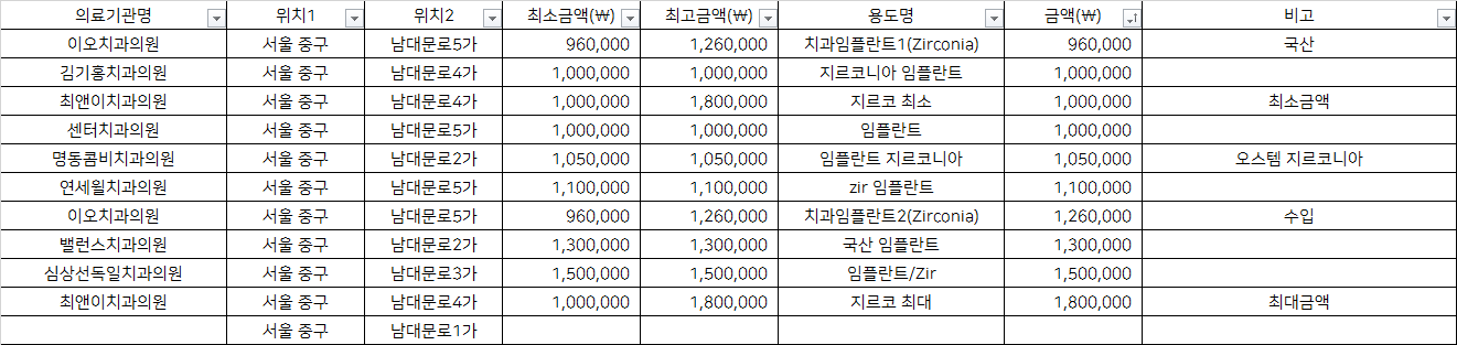 지역별 금액을 비교하시어 거주지 근처에서 저렴하게, 합리적인 비용으로 임플란트 시술 받으시기를 바랍니다.