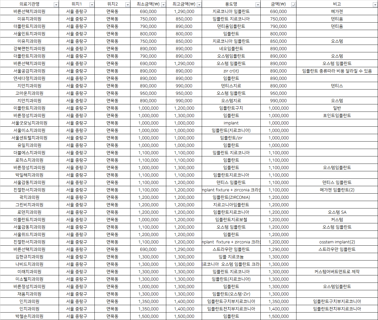건강보험심사평가원 비급여 진료비용 정보 중, 서울 중랑구 면목동의 치과임플란트 1치당 지르코니아 가격을 기준으로 알려드립니다.