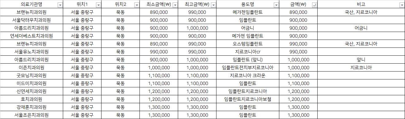 지역별 금액을 비교하시어 거주지 근처에서 저렴하게, 합리적인 비용으로 임플란트 시술 받으시기를 바랍니다.