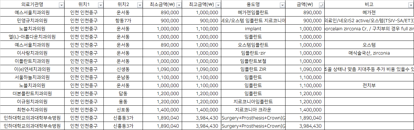 인천 중구 운서동 기타동 지르코니아 임플란트 치과 가격 top5 예스서울 민영규 노블