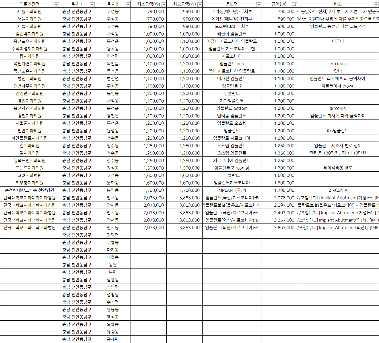 충남 천안 동남구 기타동 지르코니아 임플란트 치과 가격 top5 새늘 김앤박 목천포유